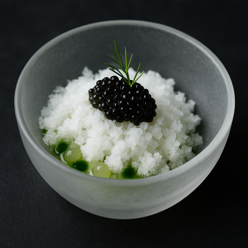 Caviar & Buttermilk Snow Frozen buttermilk shards, dill oil, pickled cucumber pearls, and caviar. __