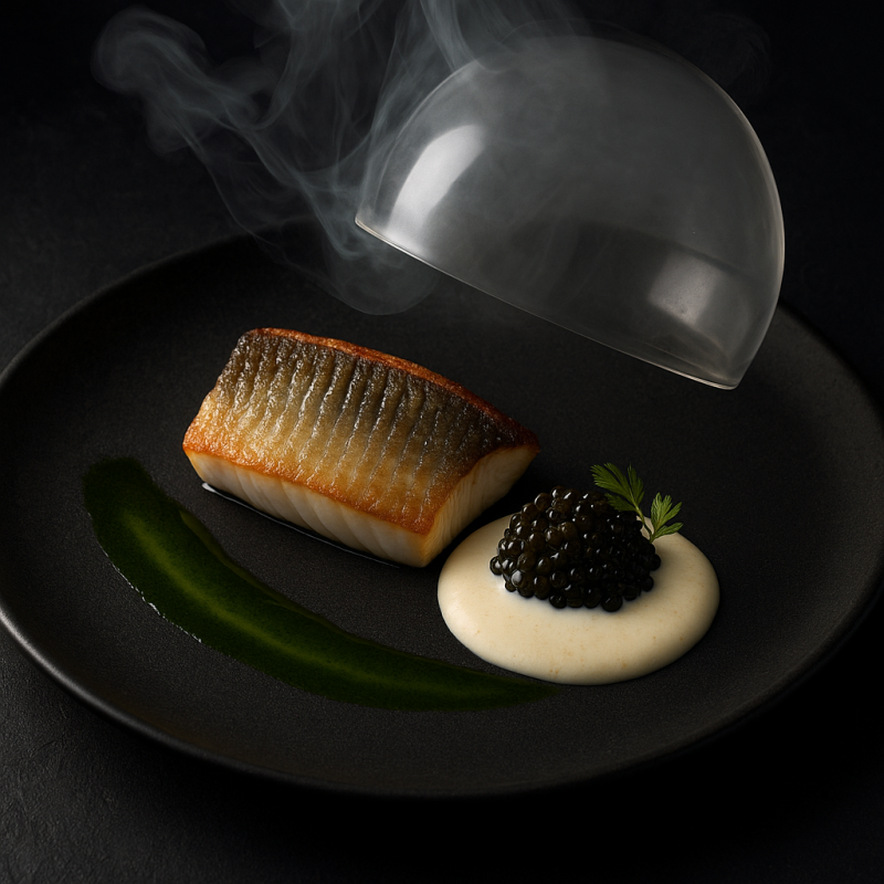 “Birch-smoked pike perch with caviar and sea lettuce — the forest and sea in one breath.”